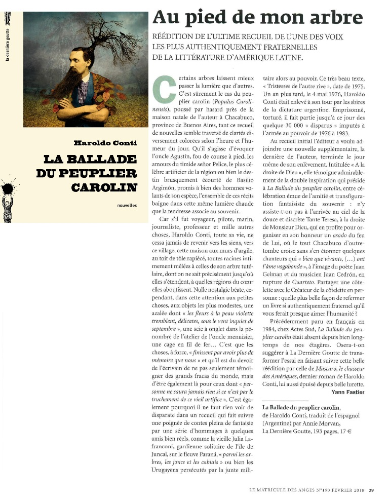 « On ne peut plus ignorer que les arbres ont une vie, une vie secrète. Le peuplier carolin de Haroldo Conti a même une âme; il grandit, il apprend, il se souvient : le vieux colosse sauvage est un être vivant, il se dresse, il est debout. Et l’homme à l’ombre de son feuillage, écrasé par un labeur estival, rêvera qu’il est, aussi, un arbre. Dans ce recueil de nouvelles, Haroldo Conti – un « disparu » de la dictature argentine – nous trace l’effacement, la disparition des lieux de son village natal Chacabuco, mais aussi celle des écrivains, des rêveurs d’avenir, que la mort ou les militaires ont brisés, l’évanouissement d’un monde rural, un monde de lenteur, de labeur et de poésie quotidienne, de sa province argentine, de ses gens fiers et droits qui s’élèvent en leur dignité. »