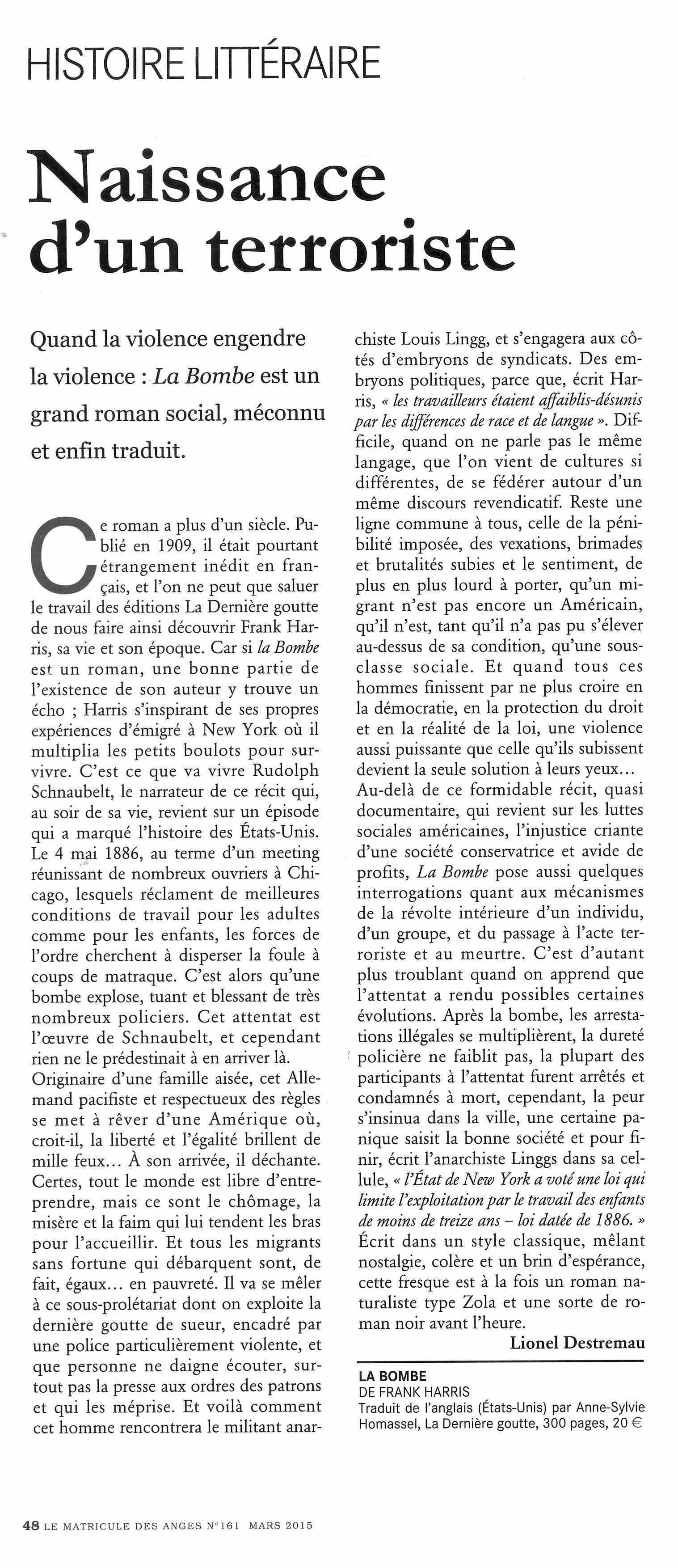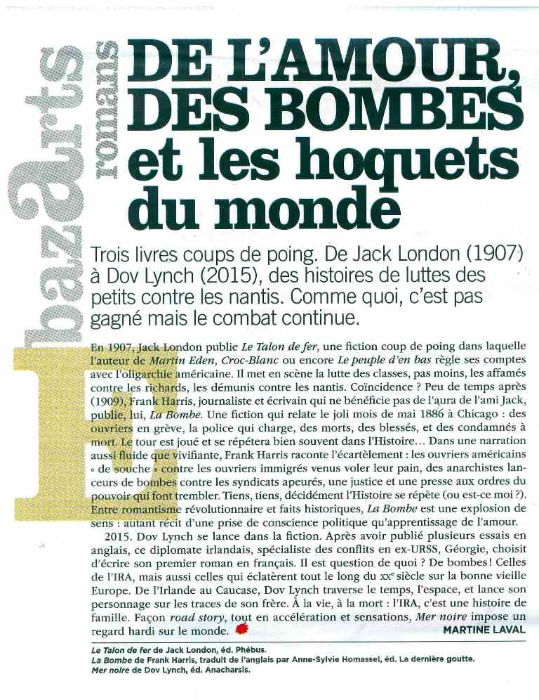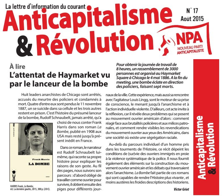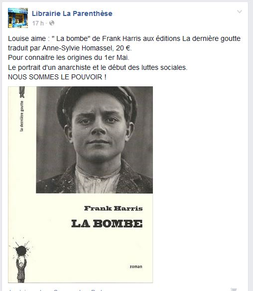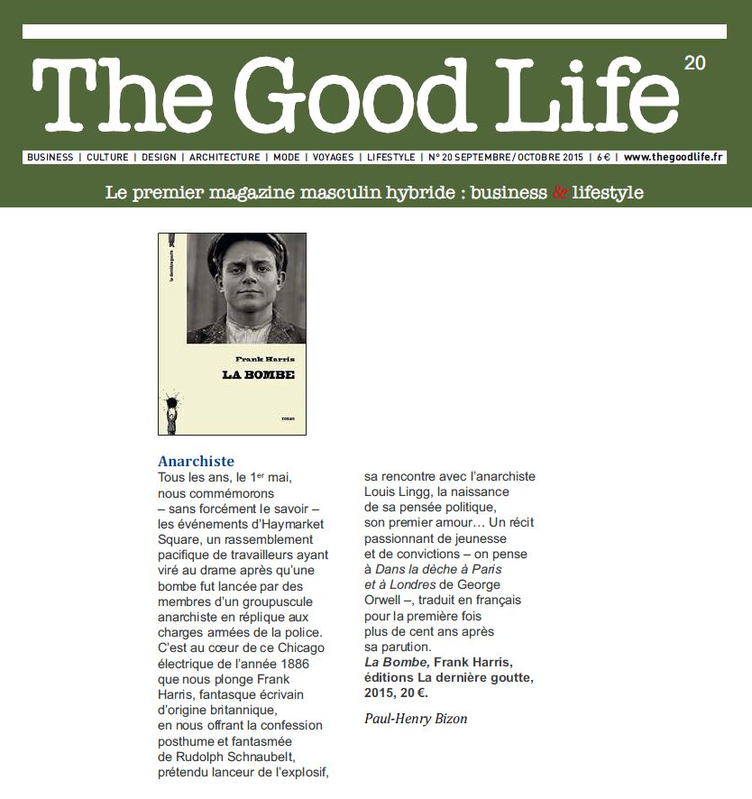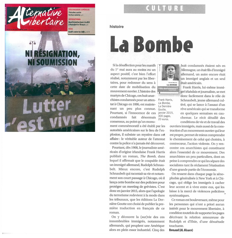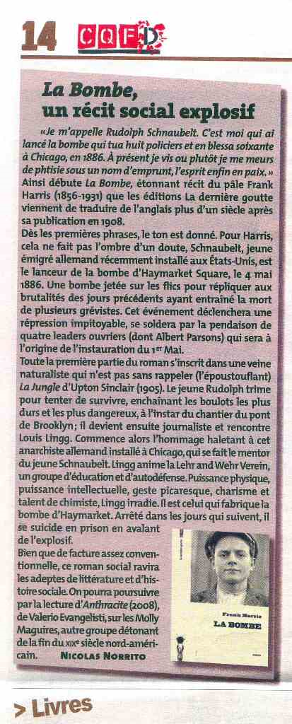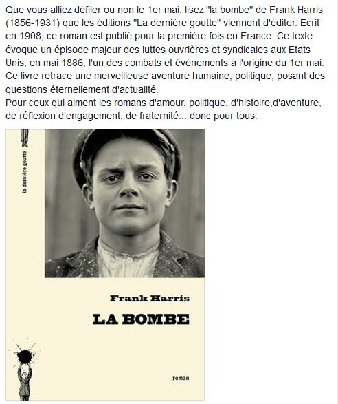 « Axé sur les affrontements trash à Chicago à l’origine du 1er mai, La Bombe de Frank Harris, sorti en 1908 aux Etats-Unis, est enfin accessible en français (La dernière goutte). Et, les loulous, il porte bien son titre. »