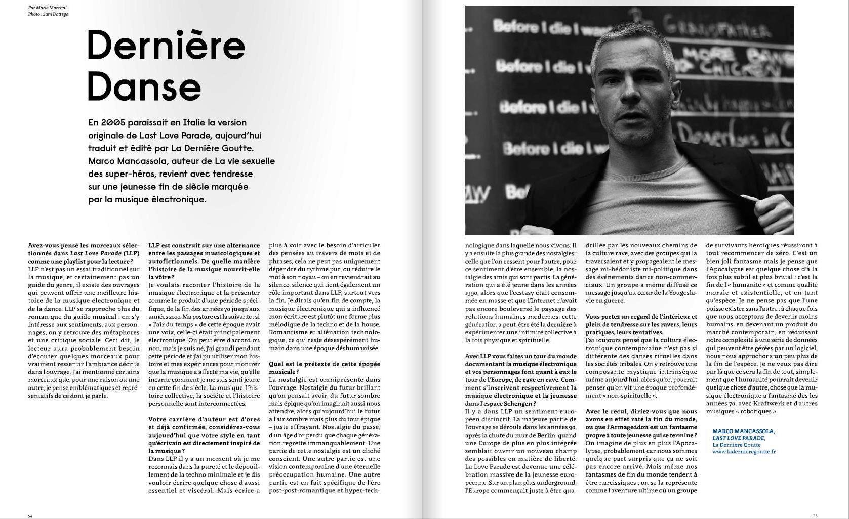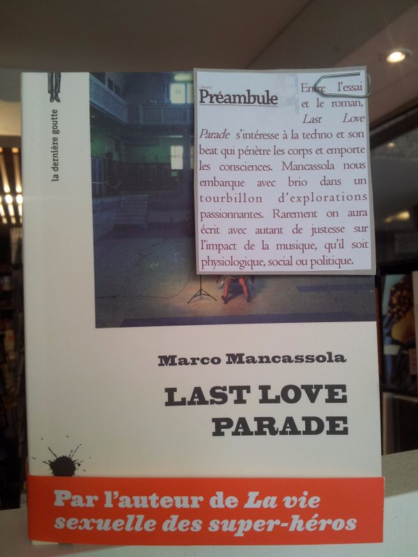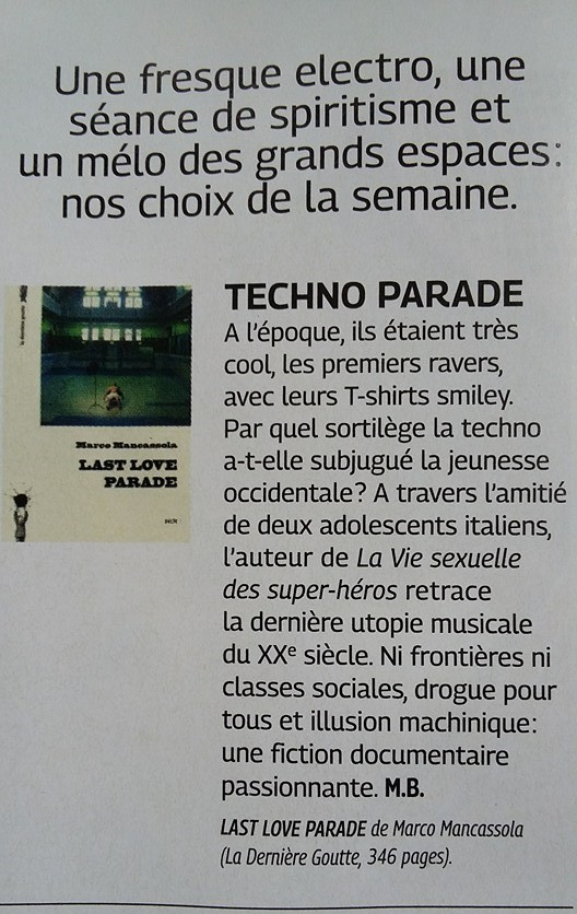 « Entre l’essai et le roman, Last Love Parade s’intéresse à la techno et son beat qui pénètre les corps et emporte les consciences. Mancassola nous embarque avec brio dans un tourbillon d’explorations passionnantes. Rarement on aura écrit avec autant de justesse sur l’impact de la musique, qu’il soit physiologique, social ou politique. »