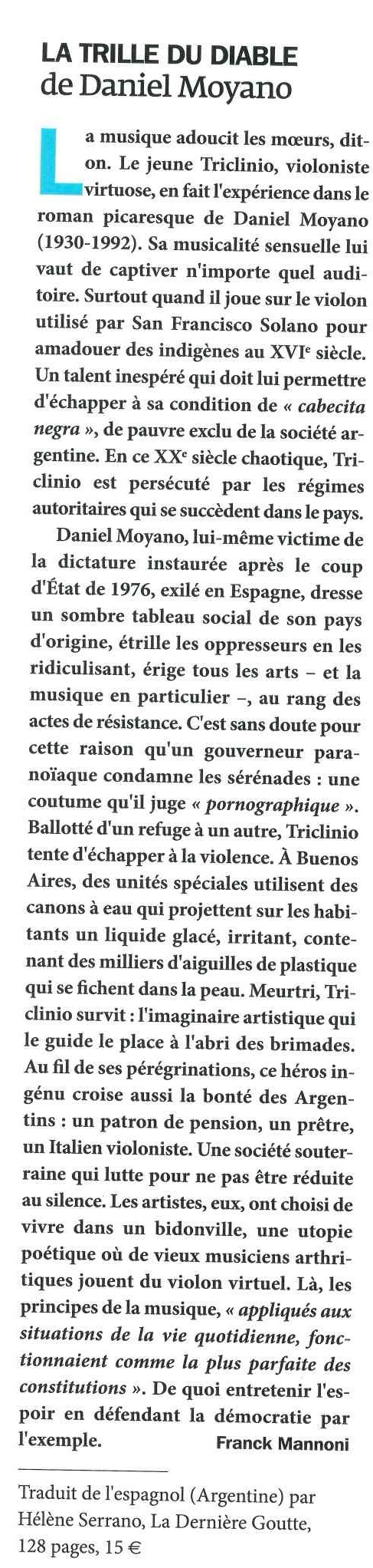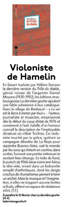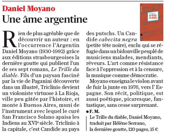 « Triclinio, violoniste surdoué, vit de notes et de portées dans la lointaine campagne de La Rioja. Rejoignant Buenos Aires, il parcourt les rues de la ville, encombrées de musiciens talentueux mais crève-la-faim. Dans une Argentine fantasque et inquiétante, où les tyrans tirent des portées et les opéras finissent en chants d’ornithorynque, la musique ne suffit pas toujours à adoucir les mœurs. Drôle, swinguant, Le Trille du diable vous joue à l’oreille un concerto cruel. Remarquablement traduit par Hélène Serrano. »