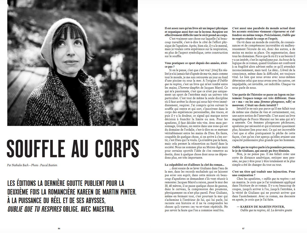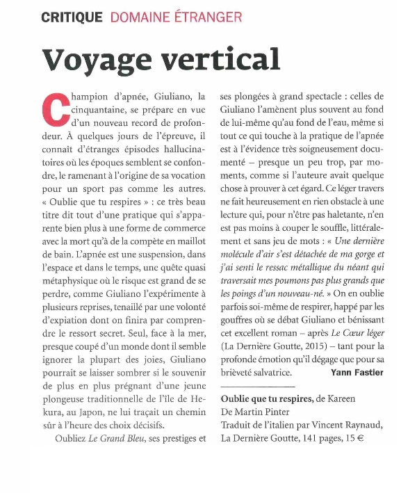 « Il y a ce vertige fascinant qui happe au long de la lecture alors que l’apnéiste s’enfonce par paliers dans les abysses. »